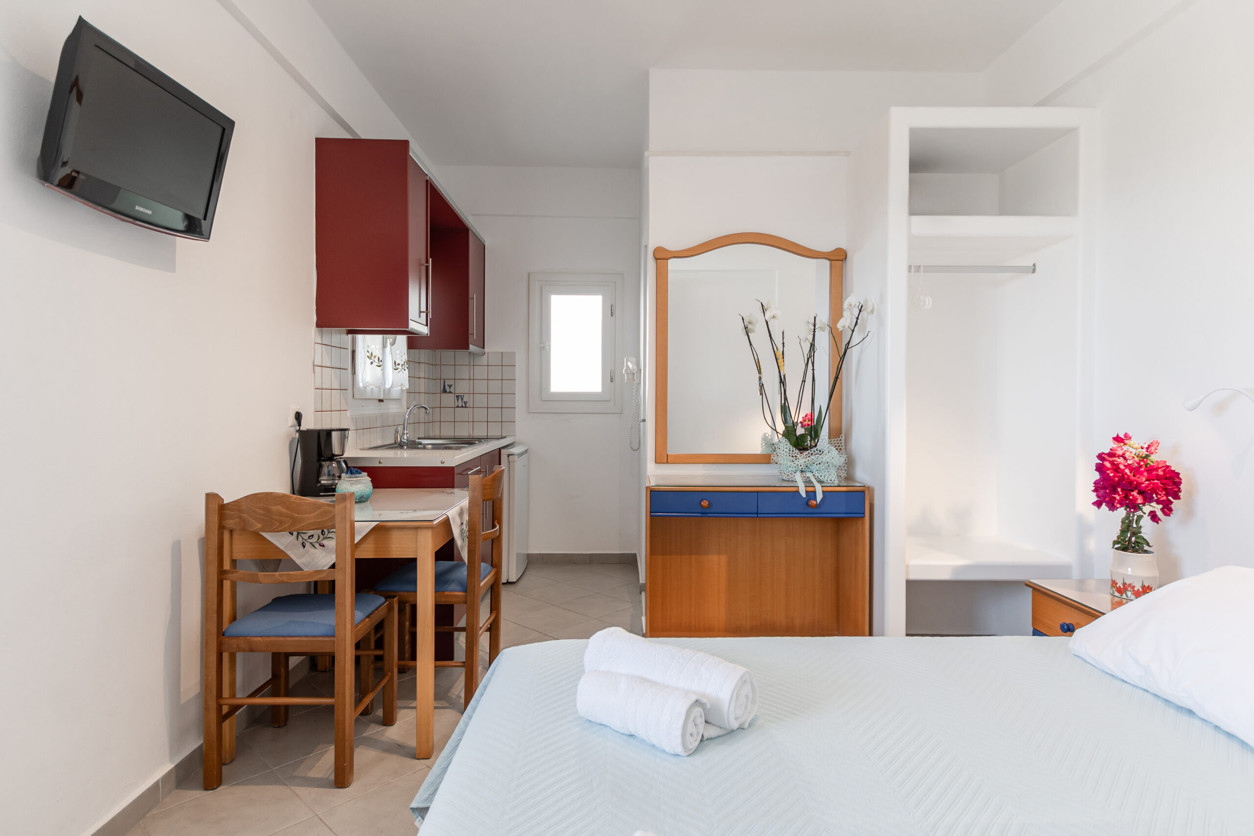 Studio is equipped one double bed, bathroom, kitchenette, flat Tv.